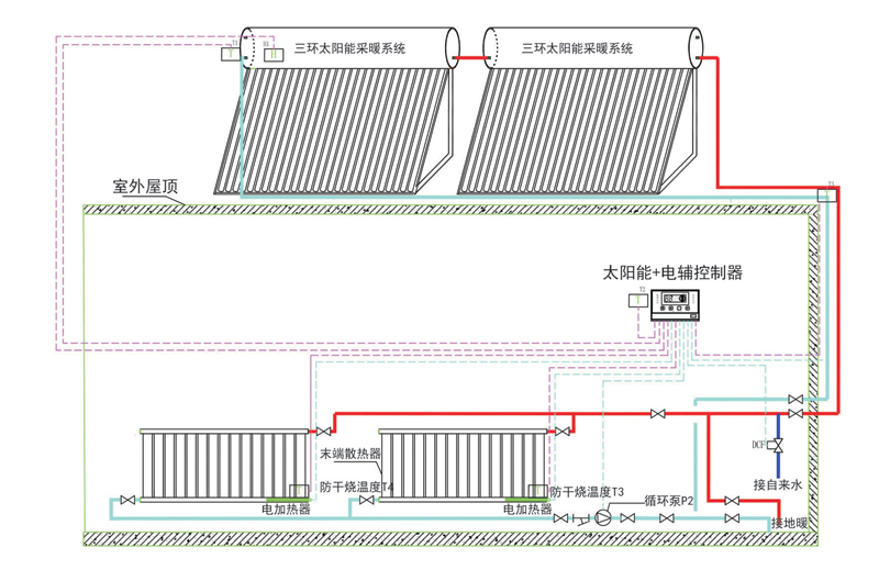 本系統(tǒng)采用3組(或2組)30支太陽能采暖機(jī)組,通過吸收太陽能輻射能量將儲水箱內(nèi)的水加熱,當(dāng)太陽能溫度達(dá)到采暖設(shè)定值(默認(rèn)值:45℃),啟動循環(huán)水泵將熱量運(yùn)送到室內(nèi)采暖末端(暖氣片或地暖),當(dāng)室內(nèi)溫度達(dá)到設(shè)定溫度(默認(rèn)值:16℃)或太陽能水箱溫度低于采暖設(shè)定溫度時循環(huán)泵停止,該系統(tǒng)以太陽能熱量采暖為主,電加熱為輔的工作模式,遙控操作使用方便。優(yōu)先使用太陽能熱量,當(dāng)太陽能溫度不夠時自動切換到電輔加熱模式,太陽能溫度恢復(fù)后,自動切換到太陽能供暖模式。